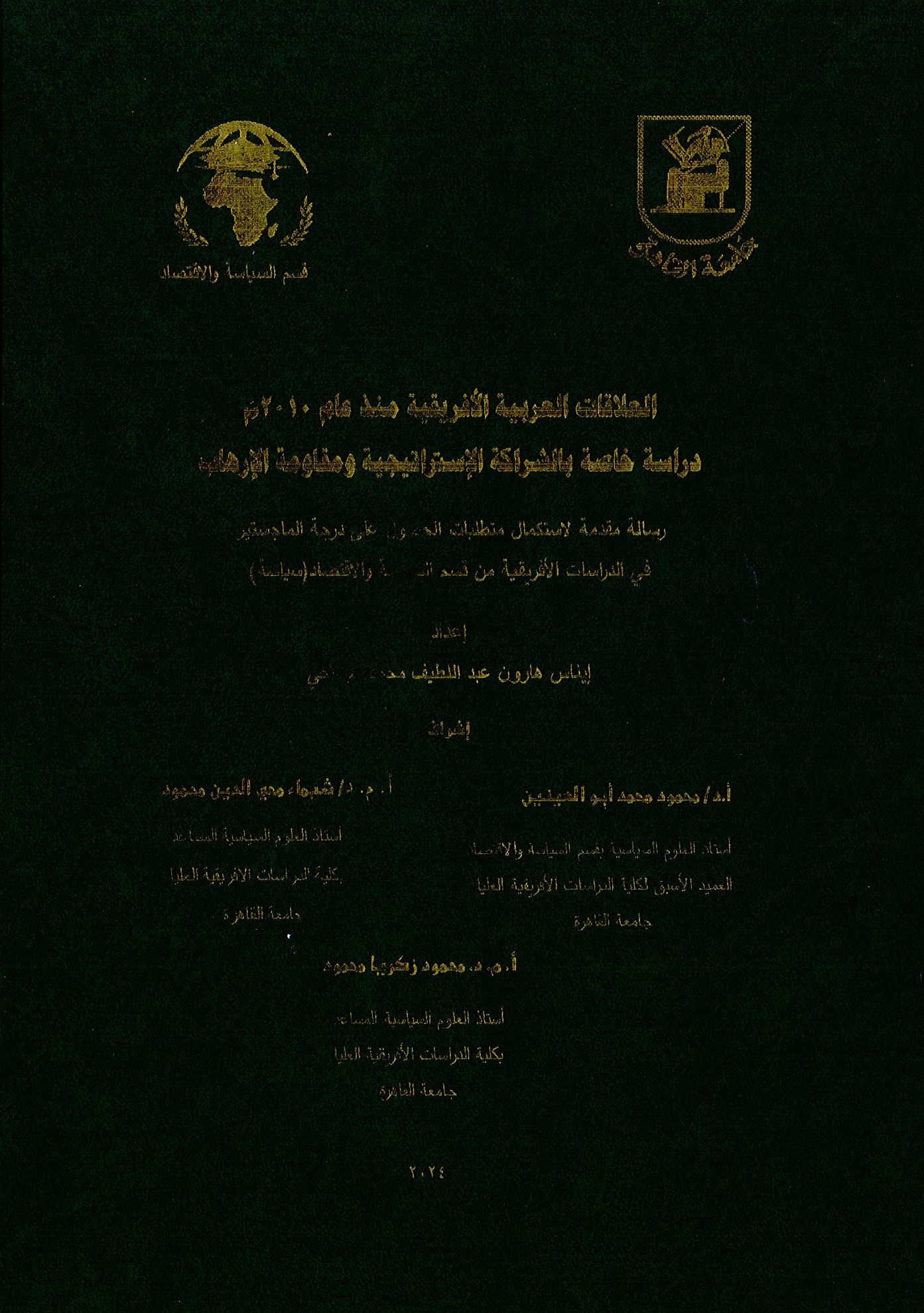 العلاقات العربية الأفريقية منذ عام 2010 : دراسة خاصة بالشراكة الإستراتيجية و مقاومة الإرهاب : رسالة مقدمة لاستكمال متطلبات الحصول على درجة الماجستير في الدراسات الأفريقية من قسم السياسة والاقتصاد ( سياسة ) |